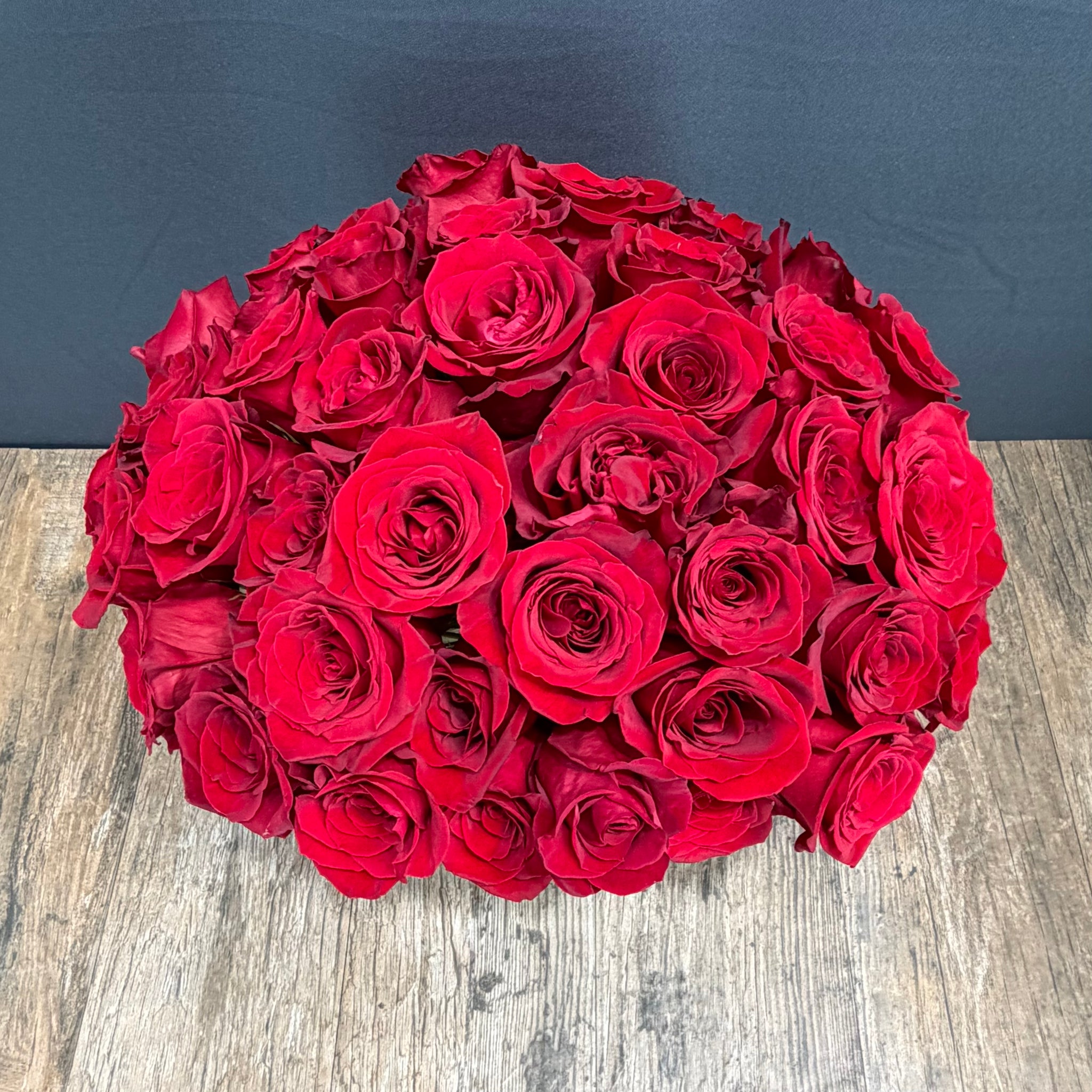 A stunning arrangement of 50 premium red roses, hand-arranged in a classic clear glass vase. This timeless bouquet is a symbol of love and admiration, perfect for any special occasion.
